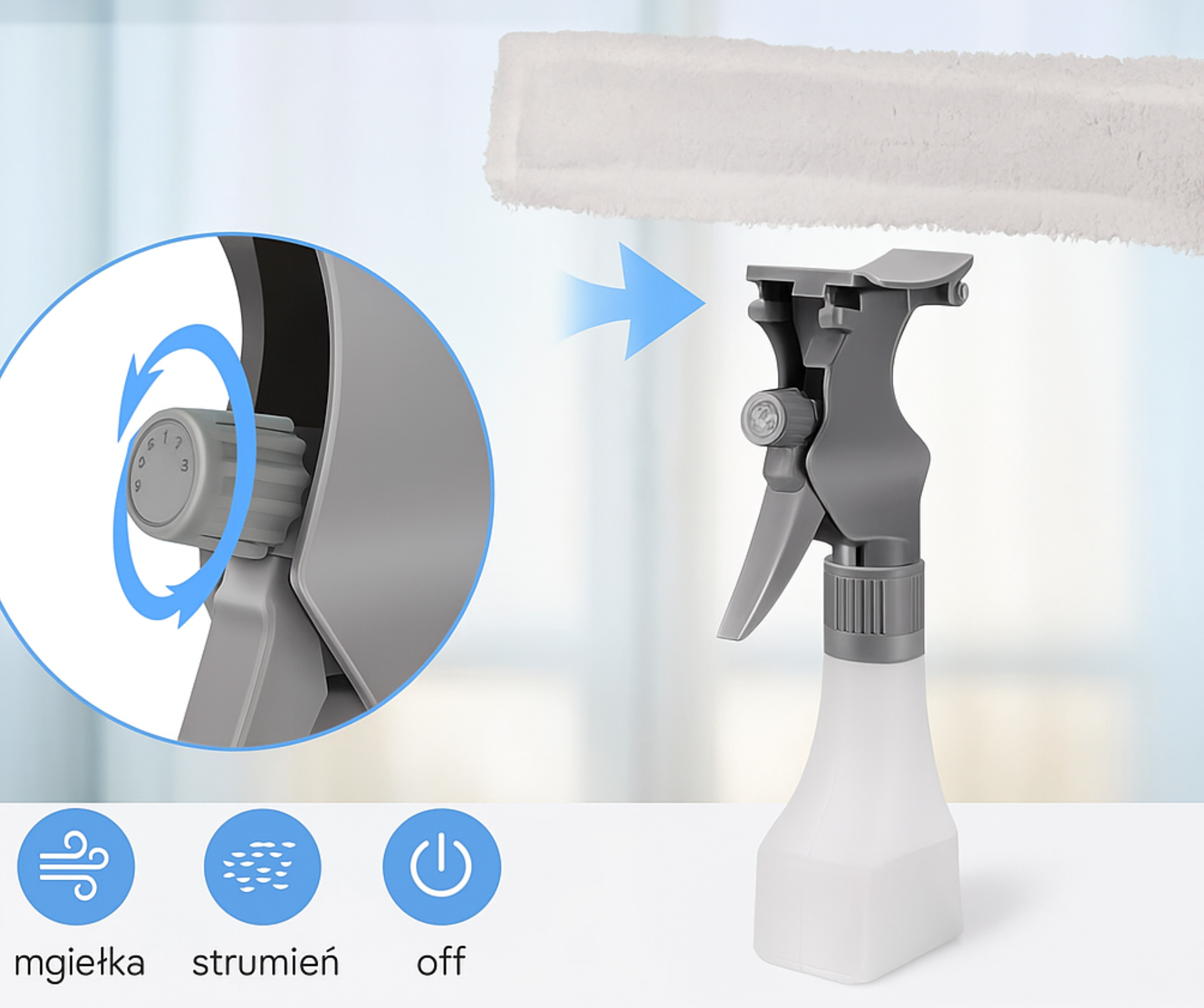 W zestawie otrzymasz ściągaczkę ClearSwipe oraz spryskiwacz ze ściereczką z mikrofibry, który ułatwia rozprowadzenie środka i wstępne czyszczenie powierzchni. Całość została zaprojektowana tak, aby usunąć zacieki, wodę i brud szybko, wygodnie i bez smug — od razu po wyjęciu z pudełka.