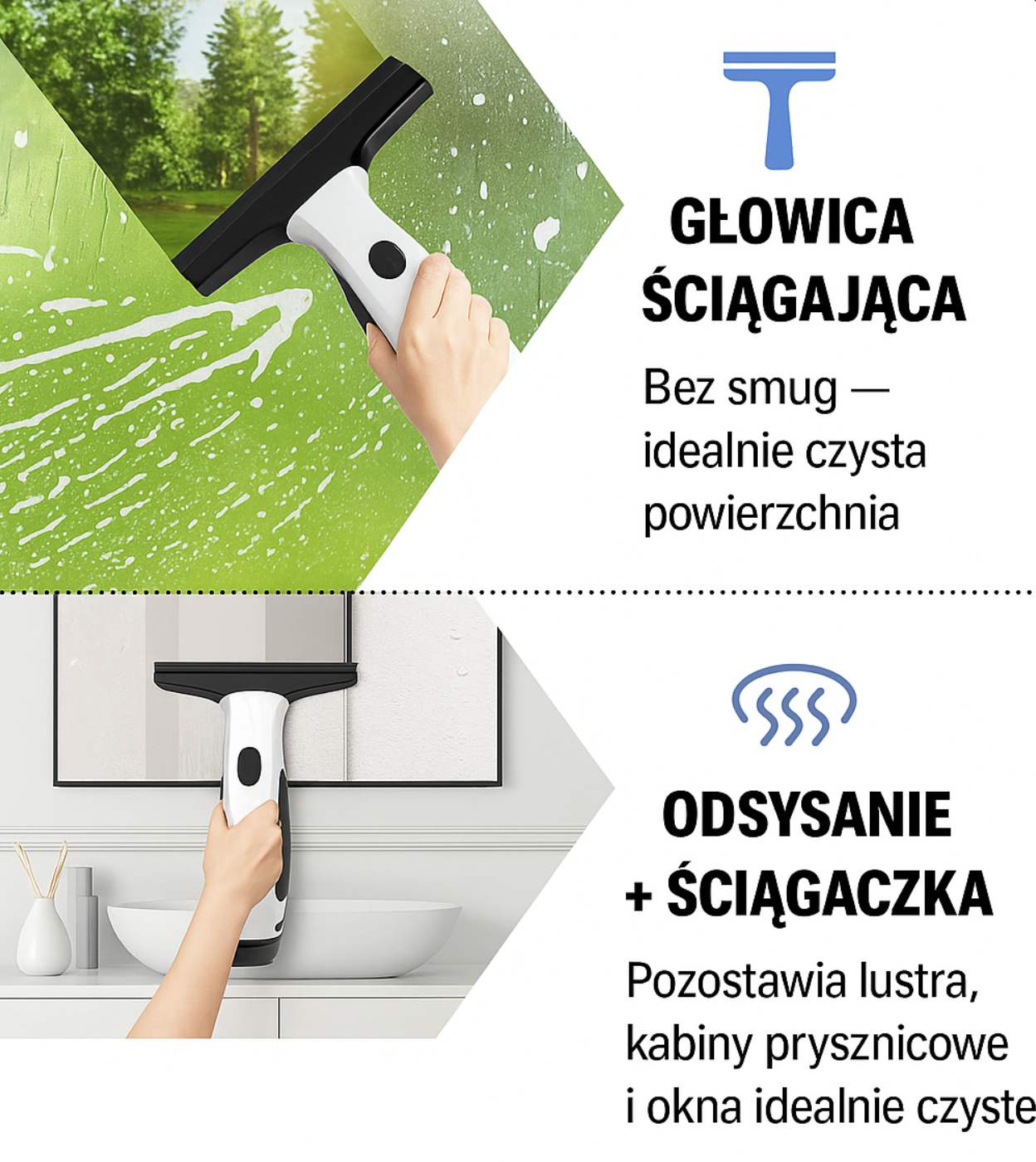 ClearSwipe wykorzystuje technologię odsysania wody i brudu, która w jednym ruchu usuwa zacieki, osad i wilgoć z powierzchni takich jak szkło, płytki czy kabina prysznicowa. Bez kapania, bez smug i bez rozmazywania brudu.